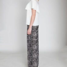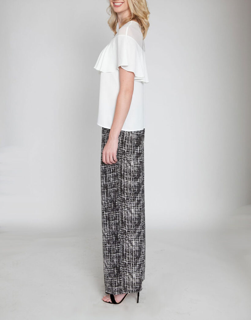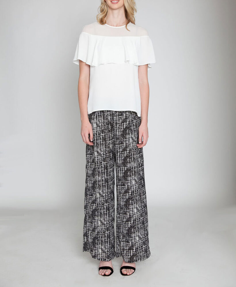 This mix mesh and stretch jersey is the definition of Desk to Dinner. Mesh and ruffle details, with a fashion keyhole button closure, make this top chic and fashion forward!