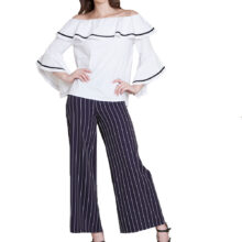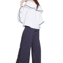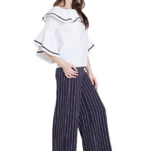 Another great piece adorned with ruffles and flared sleeves. Lightweight fabric and a contrast trim make it a perfect top for your warmer seasons!